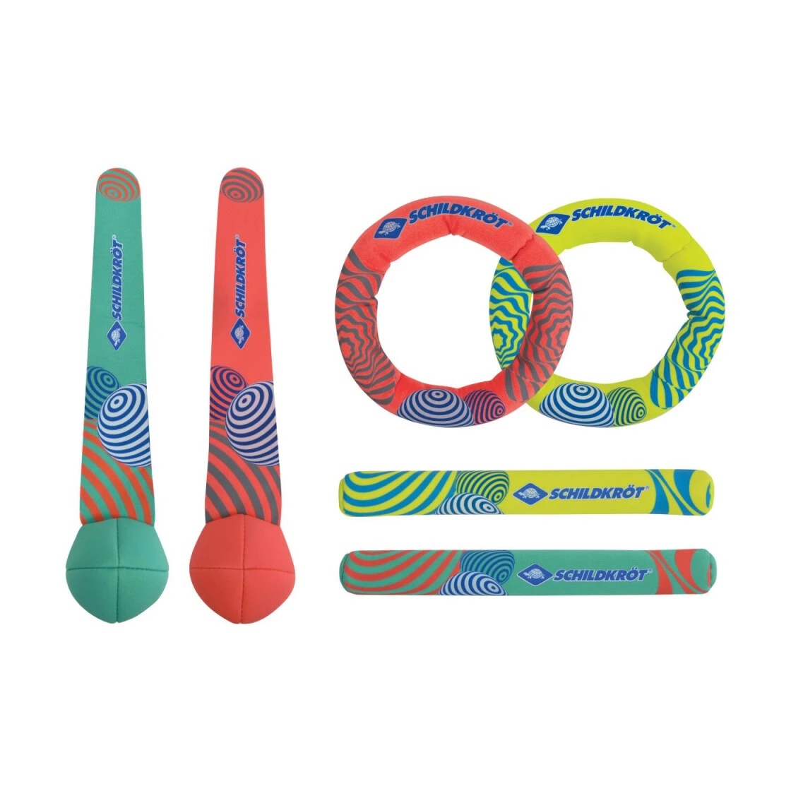 6teiliges Neopren-Tauchset bestehend aus 2 Tauchstäben, 2 Tauchringen und 2 Tauchbällen mit Schweif. Alle Teile sind mit Neoprenüberzug und Sandfüllung, dadurch weich und griffig (kein Vergleich mit den sonst üblichen harten Plastik-Tauchartikeln). Besonderheiten: Ring und Stab haben an einer Stelle einen Schaumstoffeinsatz und stehen dadurch senkrecht am Grund des Pools. Beim Tauchball steht der Schweif auf. Aufgrund dieser Eigenschaften, können auch kleinere, jüngere Kinder Ring / Stab / Ball leichter im Wasser greifen und haben ein schnelleres Erfolgserlebnis beim Tauchen.